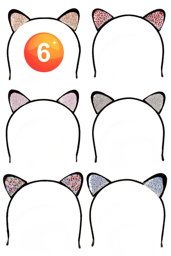 6x stuks gekleurde pailletten katten/poezen oortjes op diadeem/haarband voor dames. Zwarte verkleed diadeem met gekleurde pailletten kattenoortjes. Materiaal: kunststof. Carnaval feest/party verkleed accessoire.