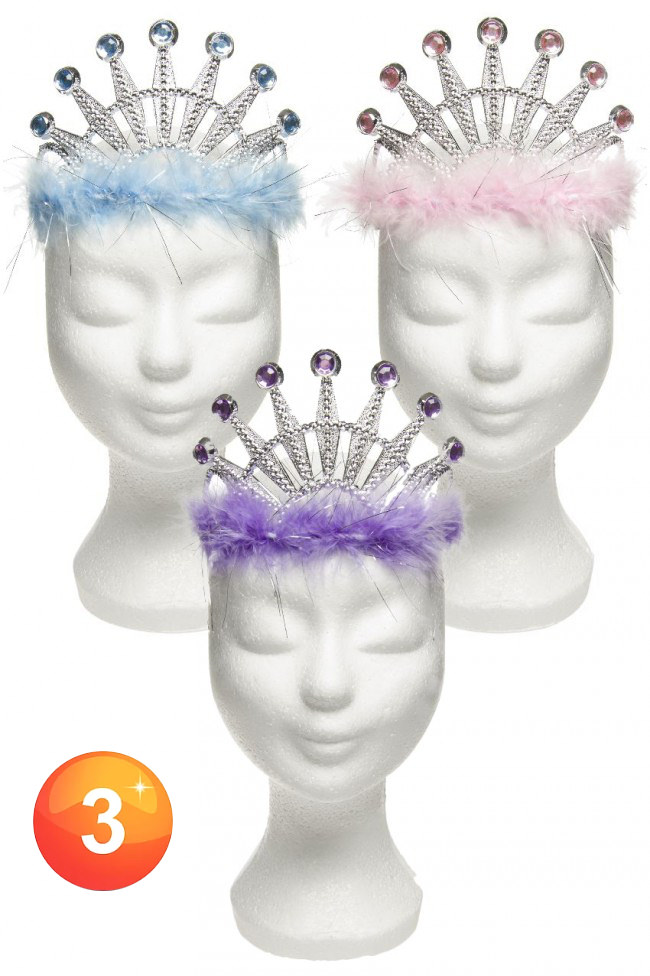 3 Kroontje zilver met gekleurd boa randje blauw, roze en paars Afmeting 11,5 x 5 x 9,5 cm meer