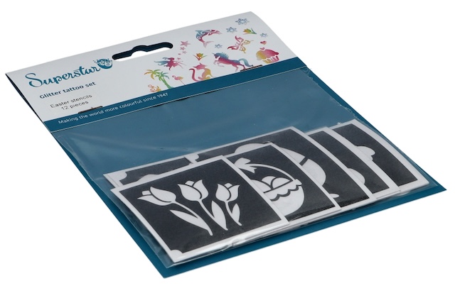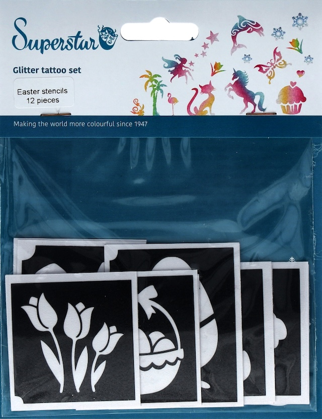 Superstar Glitter Pasen tattoo stencils 12 stuks (98818). Er is geen kind dat nee zegt tegen een Pasen glittertattoo. Wist je dat het eigenlijk heel makkelijk is om ze zelf te zetten? Zelfs een kind kan de was doen, en dat bedoelen we letterlijk. Dus als jij op zoek bent naar een uniek cadeau of een leuke activiteit op een kinderfeestje, dan krijg je met de complete glitter Pasen tattoo set van Painting Faces heel veel blije kindergezichten. Deze set bevat Pasen sjablonen die bij zowel jongens als meisjes in de smaak zullen vallen.